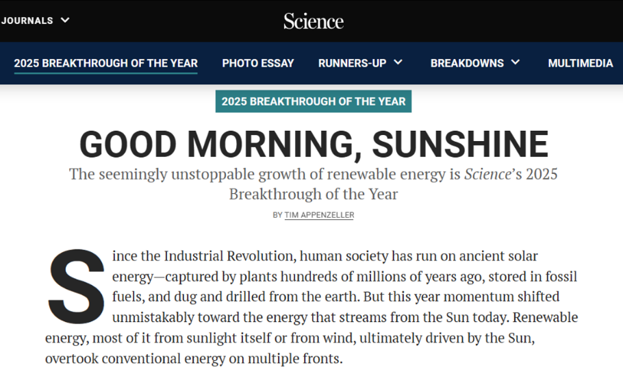 《科学》杂志每年年底都会评选年度科学突破,介绍当年最重大的科学发现、科学进展和趋势。近期,《科学》以“早安,阳光”为题,将太阳能评选为2025年度科学突破,详细介绍中国可再生能源产业。